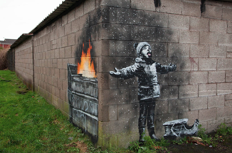 A year earlier, Banksy wrapped a garage corner in Port Talbot, Wales, transforming architectural geometry into narrative horror. On one wall: a child in winter clothes, tongue out to catch snowflakes, sleigh ready nearby. Turn the corner: a dumpster fire spewing ash and smoke directly at the kid. The "snow" was industrial fallout.