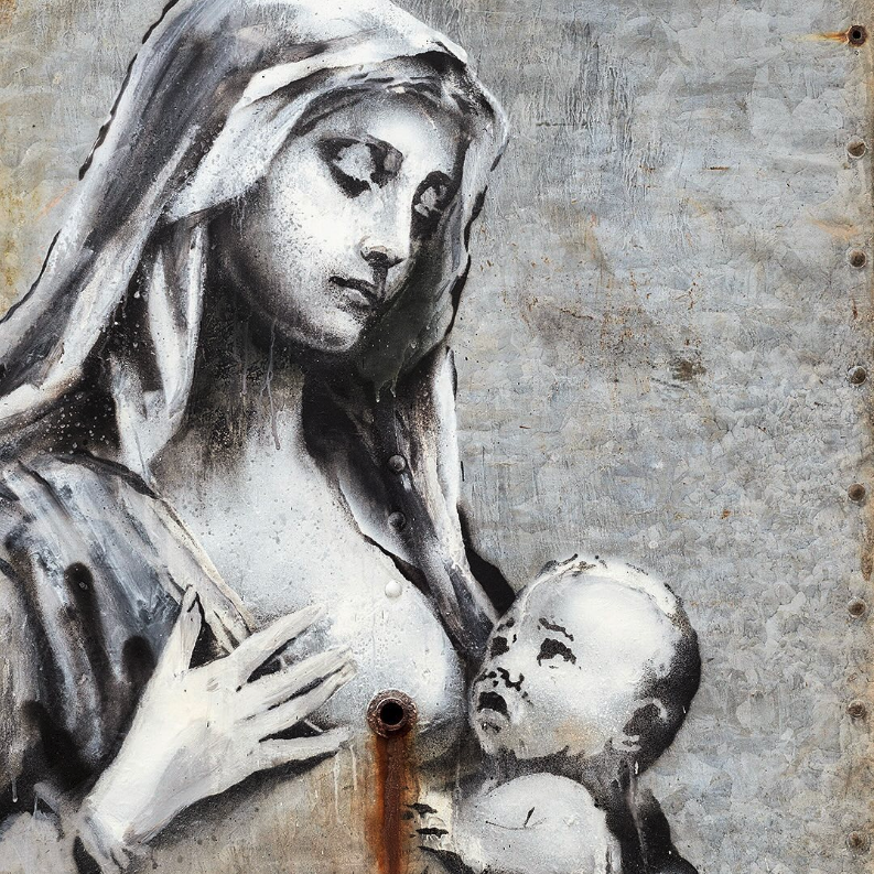 In December, 2024, Banksy confirmed his creation of a mural showing a breastfeeding Madonna, her face veiled, the infant Christ looking up in distress. Where Renaissance masters painted nipples, Banksy placed a rusted hole in the metal surface itself, industrial decay bleeding into sacred iconography.