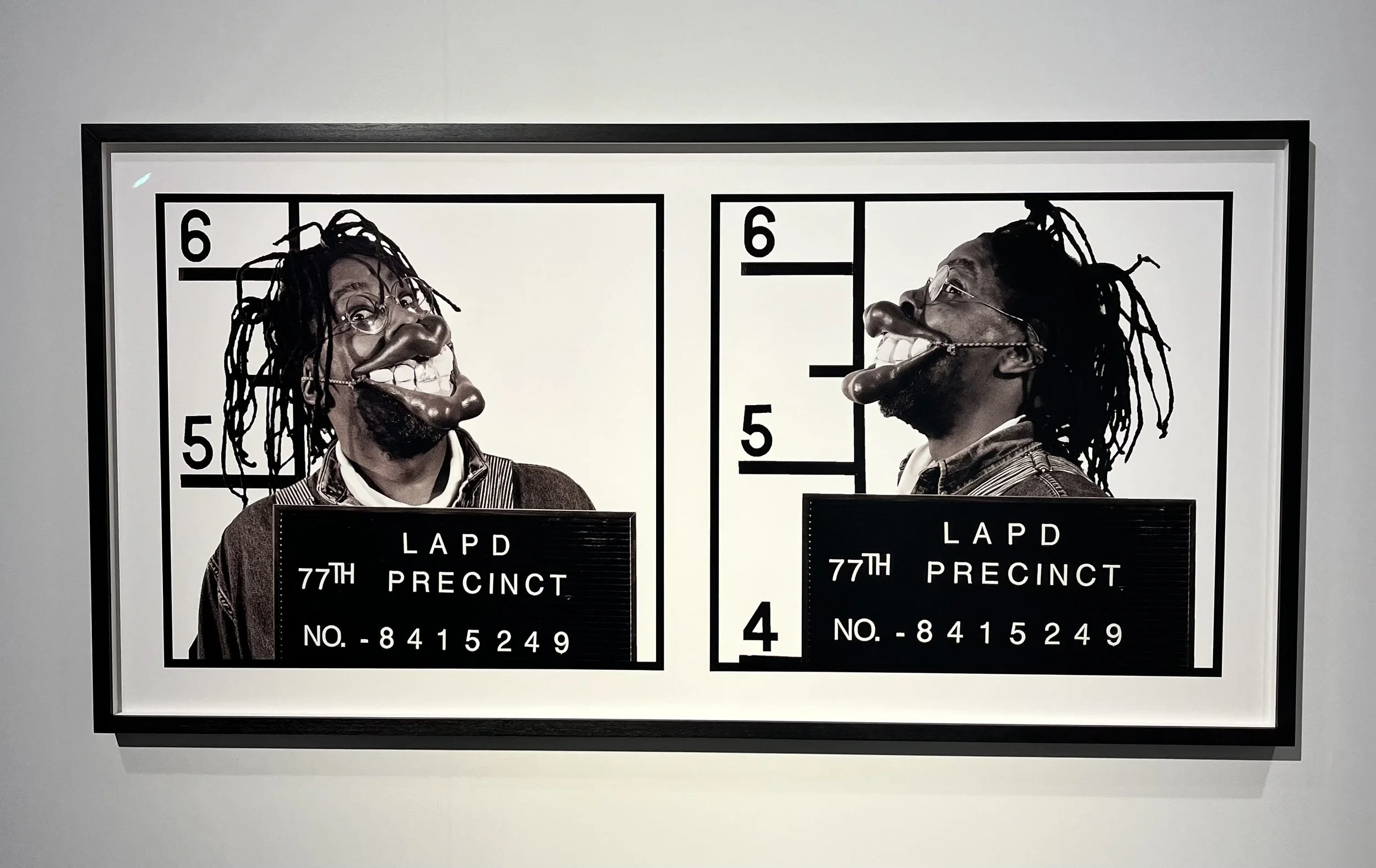 The presentation offers a collection of early self-portrait drawings created between 1958 and 1965 before fast forward to a stunning work called CHARGED with Disturbing the Peace, a 1998 photographic diptych that parodies American racial stereotypes. The work satirizes a Los Angeles Police Department mug shot of a black man with a wildly exaggerated, smiling, toothy mouth.