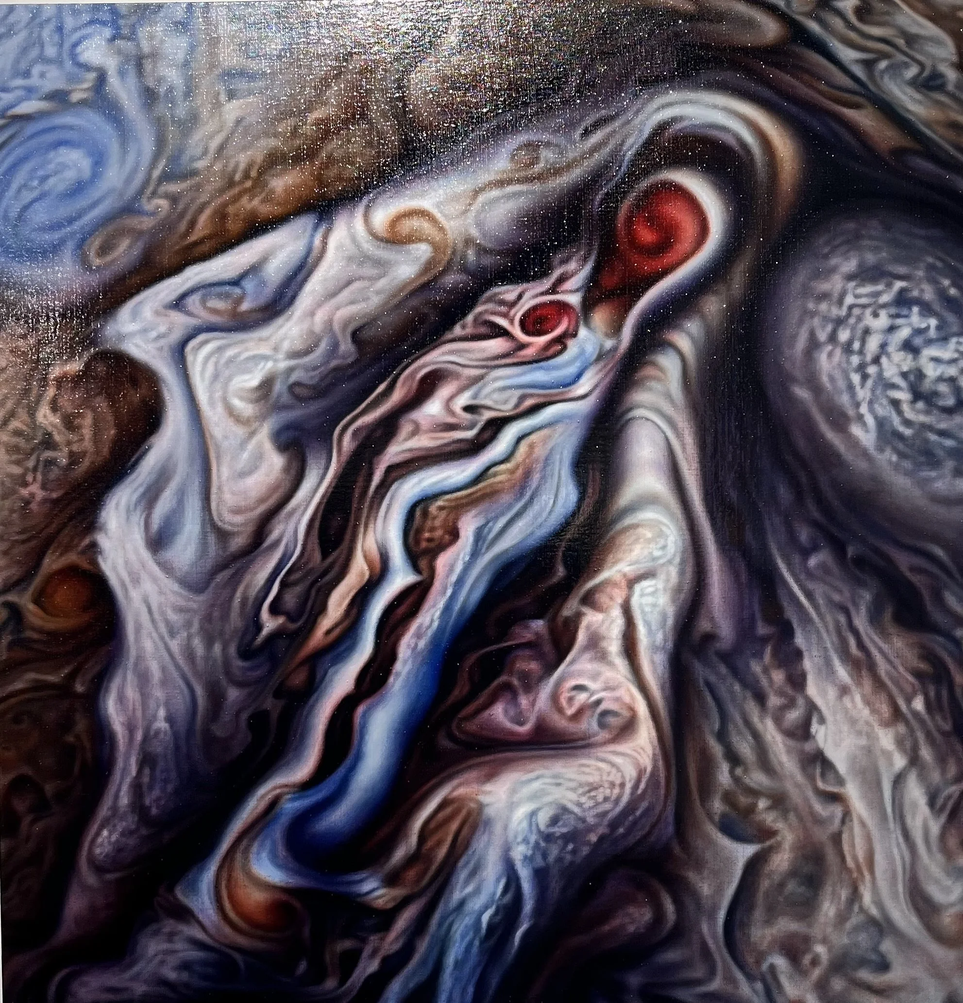 Here, you’ll also find a work by self-taught American artist Damian Loeb, whose piece Immaculate Conception, in oil on linen, is a none-too-subtle exploration of ecclesiastic femininity in swirling, animated, psychedelic patterns. The Virgin Mary often appears to the faithful in odd places, like a grilled cheese sandwich, in one well publicized example. Loeb’s pareidolia has led him to find her in a vagina.