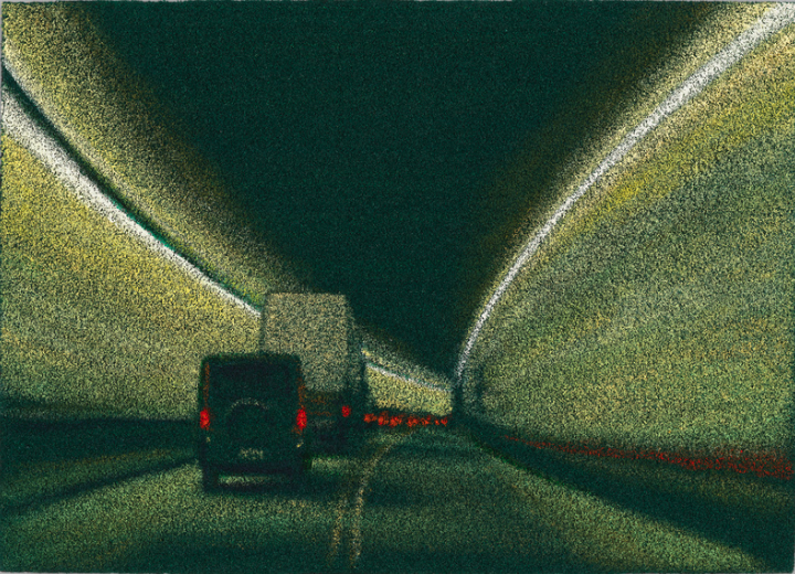 The tunnel's dramatic perspective pulls the viewer forward into darkness; the red taillights ahead suggest both guidance and warning—a visual echo of the carnival lights and neon signs that fascinate Dickson elsewhere.