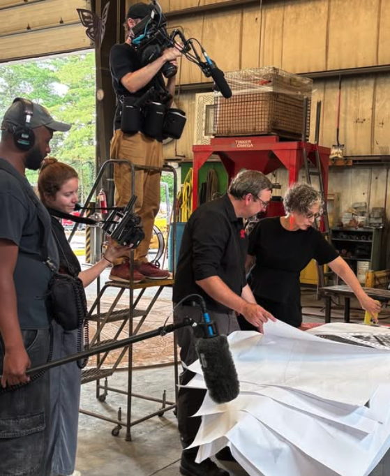 Jane Dickson discusses the casting of her monumental bronze medallion for JFK Airport at ART Research Enterprises in Lancaster, PA. The project is being documented by Meerkat Media. Photo by Charlie Ahearn.