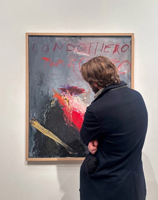 A man considers a 1988 work by Twombly, "Condottiero Testa di Cozzo," which references Italian renaissance portraiture. Photo by Jamie Lubetkin