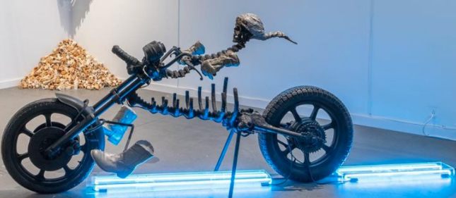 Marsha Pels, Dead Cowboy (2008), a portrait of a fossil in motion, a ghostly macho remainder, of swagger turned sinister. Cast epoxy resin, cast rubber, deconstructed motorcycle, steel, neon lights, argon-mercury text on wall, Lubov Gallery, 5 E Broadway #402