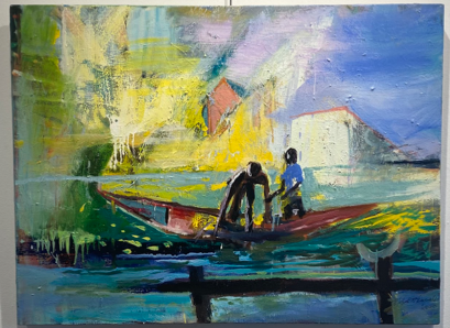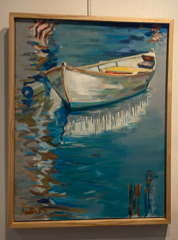 Hamptonities and lovers of the water and sea found nautical themed pieces in many abstract forms. Two favorites includes “Grab The Fish,” an illuminating oil painting by artist Michael McDowell, and “Tribute to Kote,” an acrylic piece by Bob Sullivan. The latter painting depicts a white boat on calm waters, offset to the right of a shimmering blue canvas.