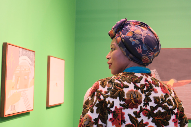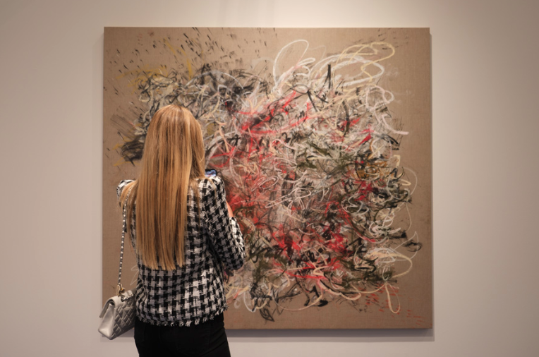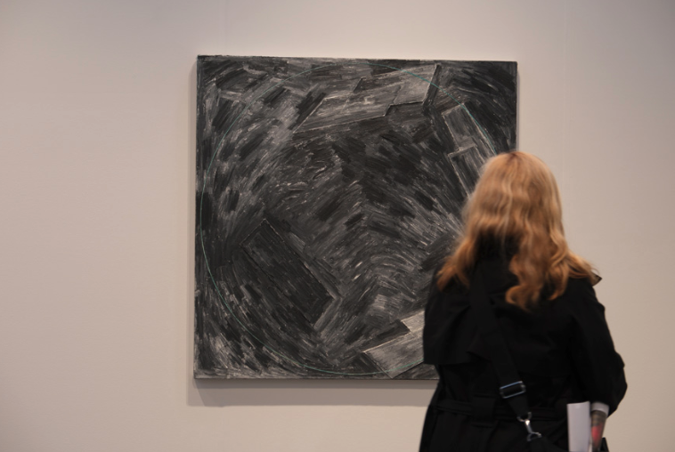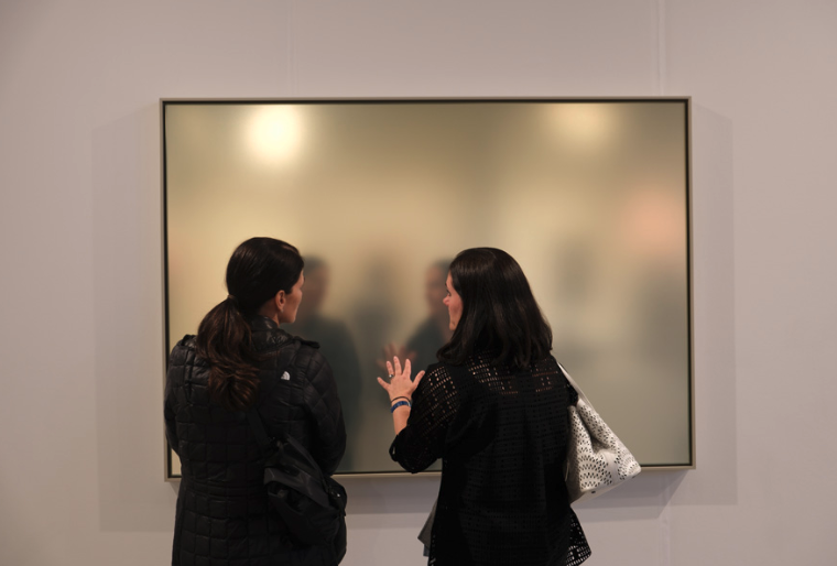 A Frieze attendee stands before art. Photo by Jamie Lubetkin