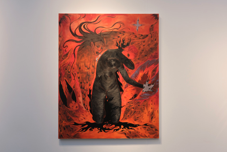 Naudline Pierre is a Brooklyn-based artist whose current work deals in themes of spirituality, salvation, doubt, drama and the enduring clash between good and evil, heaven and hell. Presented by New York’s James Cohan Gallery, her work at Frieze is rife with angelic female figures, often facing threat from fire, celestial currents and swirling lurkers. They are action-packed tableaus, alive with movement and emotion.