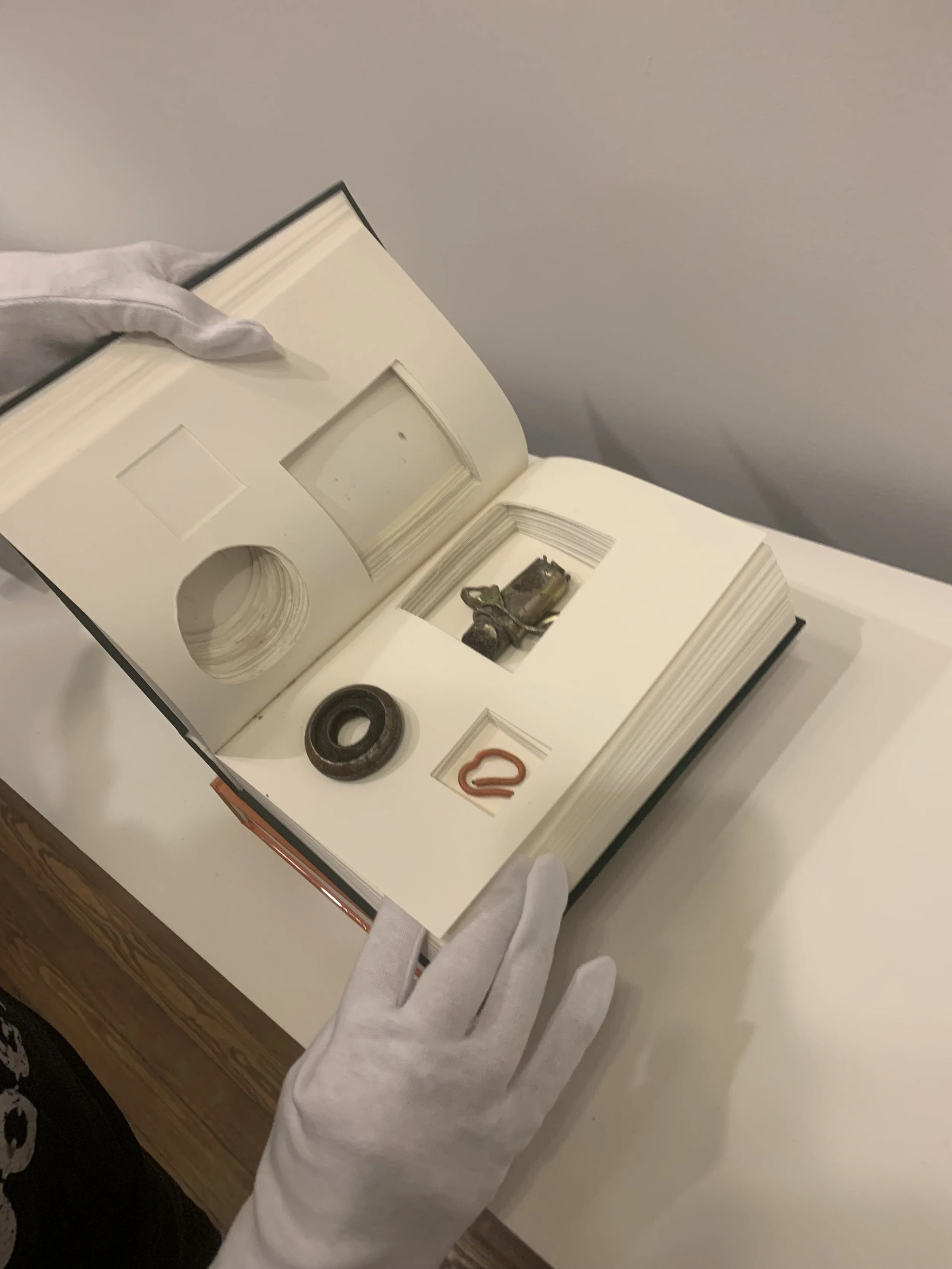 As a child roaming the streets and playgrounds of New York, Liu began a lifelong practice of collecting found objects whose use value had long passed. Her dedicated interest in salvaging the disregarded has culminated in her ongoing “Lost and Found” series. Liu rehouses her objets trouvés inside books bound in discarded fabric from an Italian printing house. Now numbering more than 200 volumes, the books and the objects affixed within, which range from shells and glass to sculptural remnants and rusted cans, have found a new purpose. Together, the lost and disused represent an archive of place and memory, like photos in a photo album. Because Liu encourages visitors to touch and turn the pages of these books, the viewer becomes a part of the objects’ lives, and vice versa—the archive ever expanding. The thoughtfully composed sequences of these mysterious relics invite formal and conceptual connections in a process of discovery, joy, and surprise. Debossed on the spine of each richly bound book is a rendering of a human spine—a recurring motif for Liu. The interplay between these two spines speaks to the embodied experience of structuring and supporting a body of disparate elements that were once lost but have now been found.