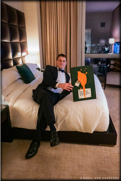 Many of his oil pieces, including the giant headshot that adorns one of the walls in the Dominick suite, are self-portraits and he often portrays himself in unlikely circumstances like wearing a tutu or falling from a wheelchair.