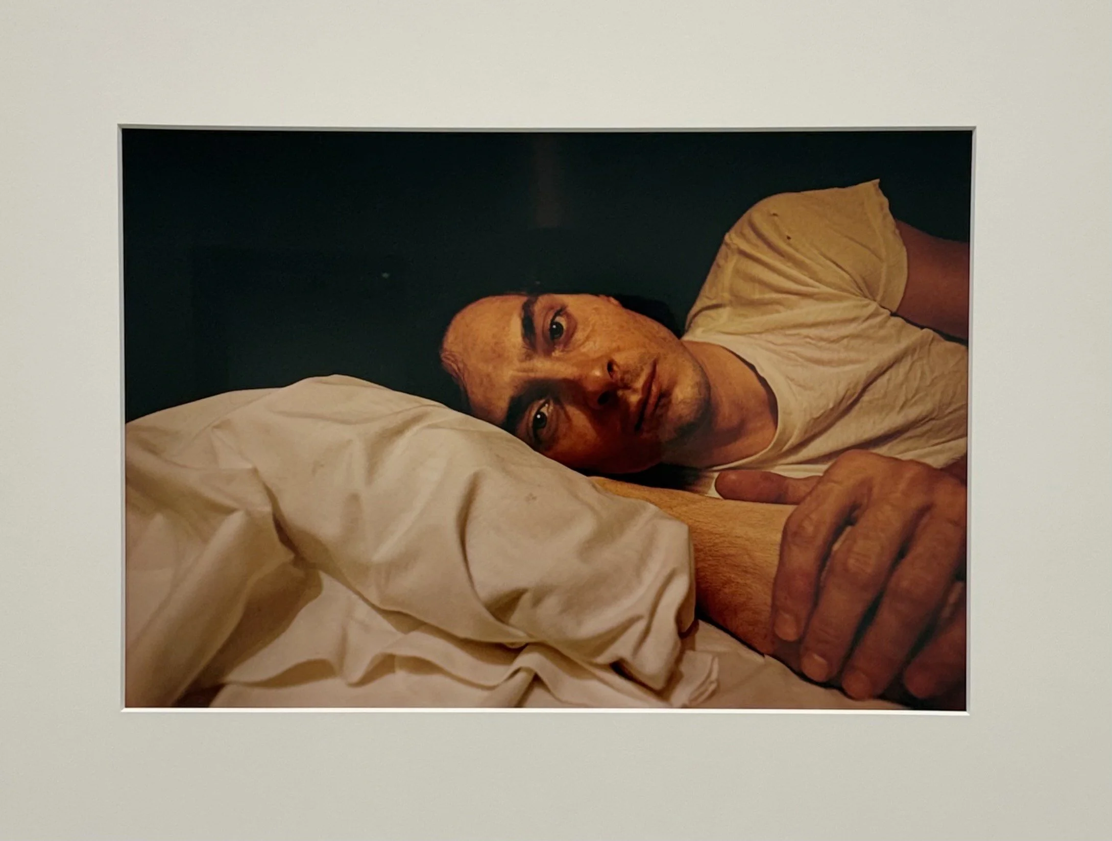 Then there are the interiors, where baroque tenebrism meets motel America. Deep blacks with brightly lit figures suspended within them. In one self-portrait, Eggleston lies in darkness, his head on a white pillow whose folds resemble carved marble. His face and oversized hand rest close to the lens, sculptural and strange. The scene evokes sacral light—a church interior relocated to some roadside room where Eggleston stopped for the night.